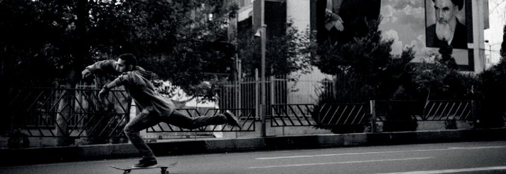 « Le vacarme est assourdissant. Sur le trottoir, toutes les têtes se retournent. A une vitesse infernale, une horde sauvage de 30 skateurs dévale les routes vertigineuses de la ville. T-shirts de marques américaines et skateboards représentant des têtes de mort, nous ne sommes pas en Californie, mais bien à Téhéran, en Iran »